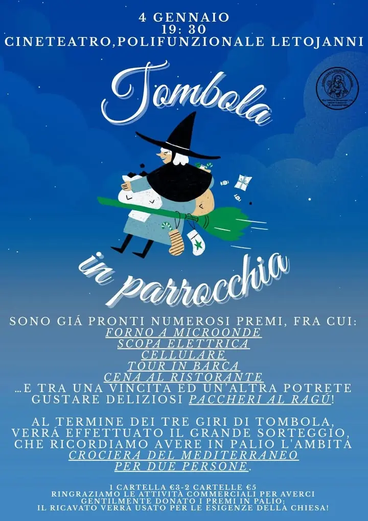đULTIMO APPUNTAMENTO IMPERDIBILE CON âTOMBOLA IN PARROCCHIAâ Il calendario degli eventi natalizi riserva ancora tanti appuntamenti imperdibili. đïždomenica 4 gennaio đŁore 19:30 đCineteatro, polifunzionale TOMBOLA IN PARROCCHIA, la tombolata organizzata dalla Parrocchia San Giuseppe, con tanti premi